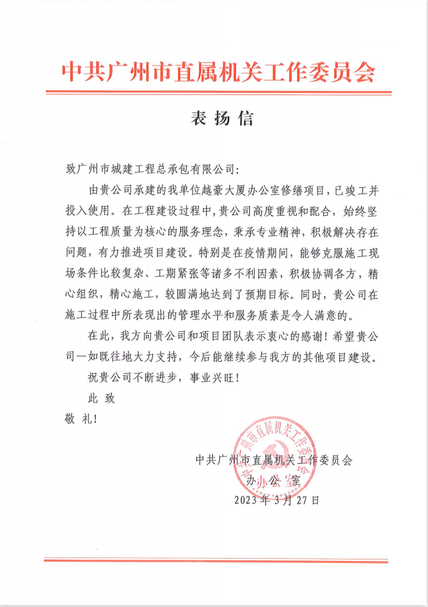 近日,中共廣州市直屬機關工作委員會向公司發(fā)來感謝信,為公司在克服施工條件復雜、工期緊張的情況下,順利完成市直機關辦公場所修繕項目表示肯定,并對公司及項目團隊表示衷心的感謝。