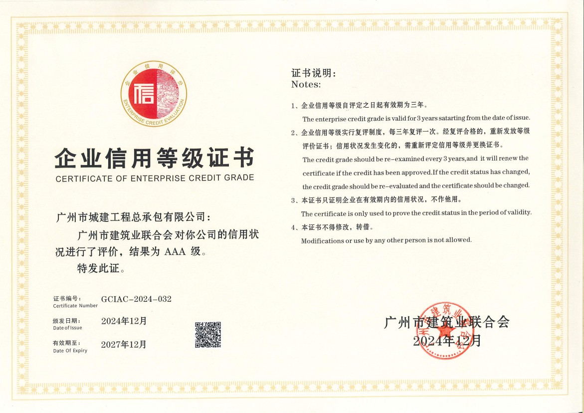 近日,廣州市建筑業(yè)聯(lián)合舉辦“誠(chéng)信企業(yè)”評(píng)選活動(dòng),對(duì)企業(yè)依法納稅、合同履約、安全生產(chǎn)、社會(huì)誠(chéng)信等管理工作進(jìn)行考察評(píng)定。公司積極申報(bào),經(jīng)評(píng)審委員會(huì)評(píng)定、向社會(huì)公示等程序,成功復(fù)評(píng)為廣州市建筑業(yè)聯(lián)合會(huì)AAA級(jí)誠(chéng)信企業(yè),...