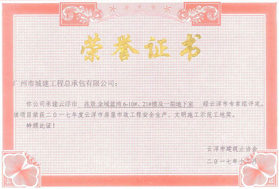 2018年1月,公司金域藍灣項目喜獲2017年度云浮市房屋市政工程安全生產(chǎn)、文明施工示范工地獎。自金域藍灣項目開工以來,公司一直不斷加強安全文明管理力度,并成立了專門的督導組,從技術、現(xiàn)場、協(xié)調、...