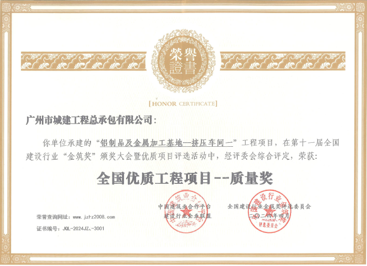 4月,公司積極參加全國建設(shè)行業(yè)“金筑獎”評選活動,經(jīng)綜合評定,由公司承建的新興鳳鋁公司鋁制品及金屬加工基地--擠壓車間一工程項目榮獲第十一屆“金筑獎”全國優(yōu)質(zhì)工程項目——質(zhì)量獎。 公司秉承“高標(biāo)準(zhǔn)、高質(zhì)量、優(yōu)...